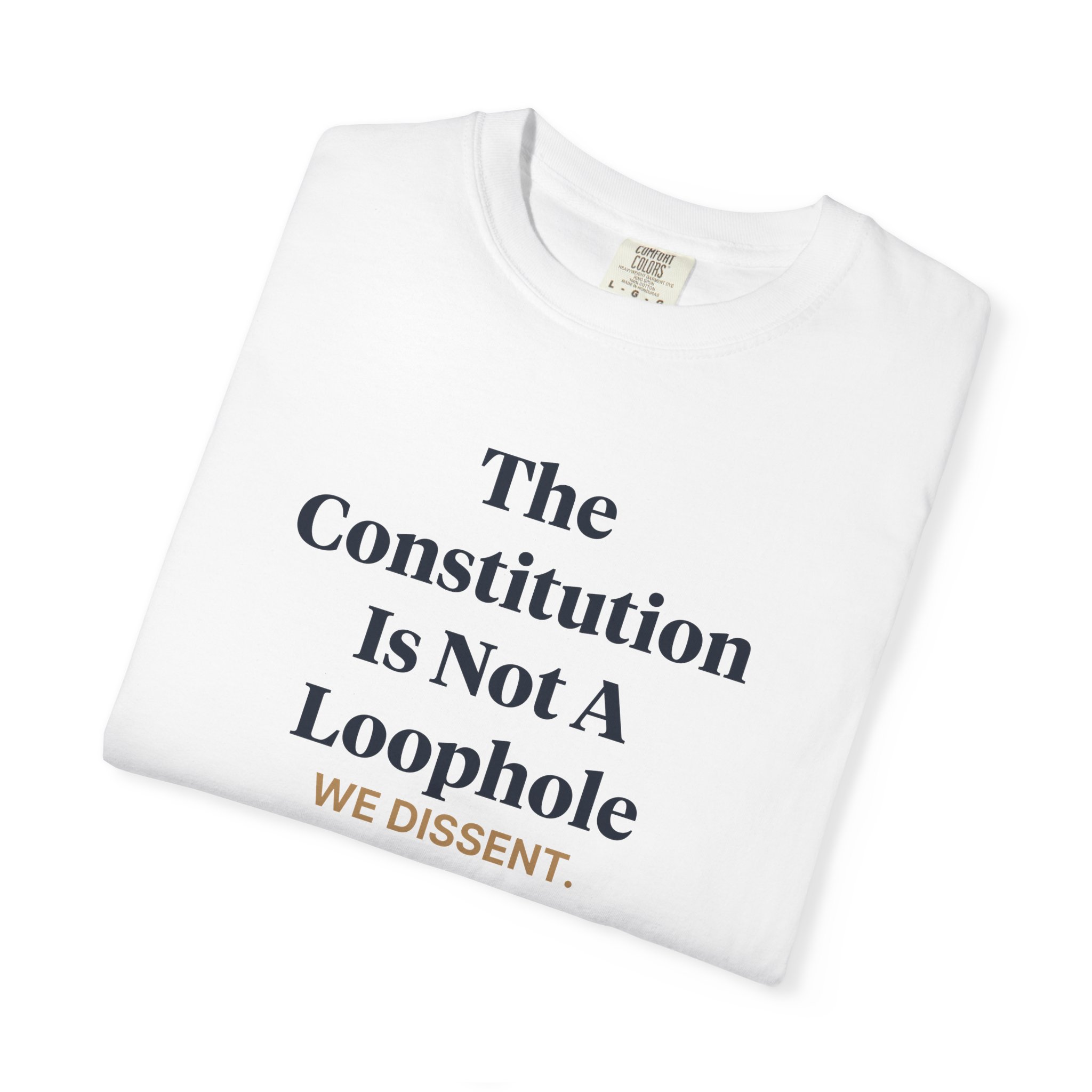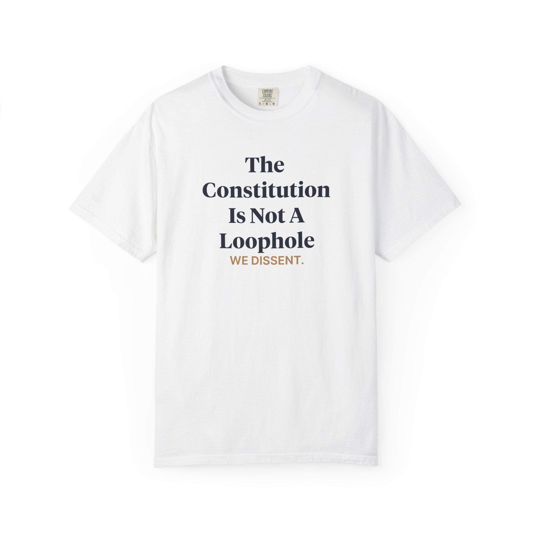 A bold unisex garment-dyed T-shirt with the phrase ‘The Constitution is Not a Loophole’ with ‘We Dissent’ below. It’s a statement against authoritarianism and fascism, emphasizing the importance of the Rule of Law. This tee gives off a rebellious and activist vibe, perfect for those passionate about civil liberties and justice. Ideal for activists, protesters, and patriots who value democracy and constitutional rights. Relevant for Independence Day, Constitution Day, protests, and political rallies.