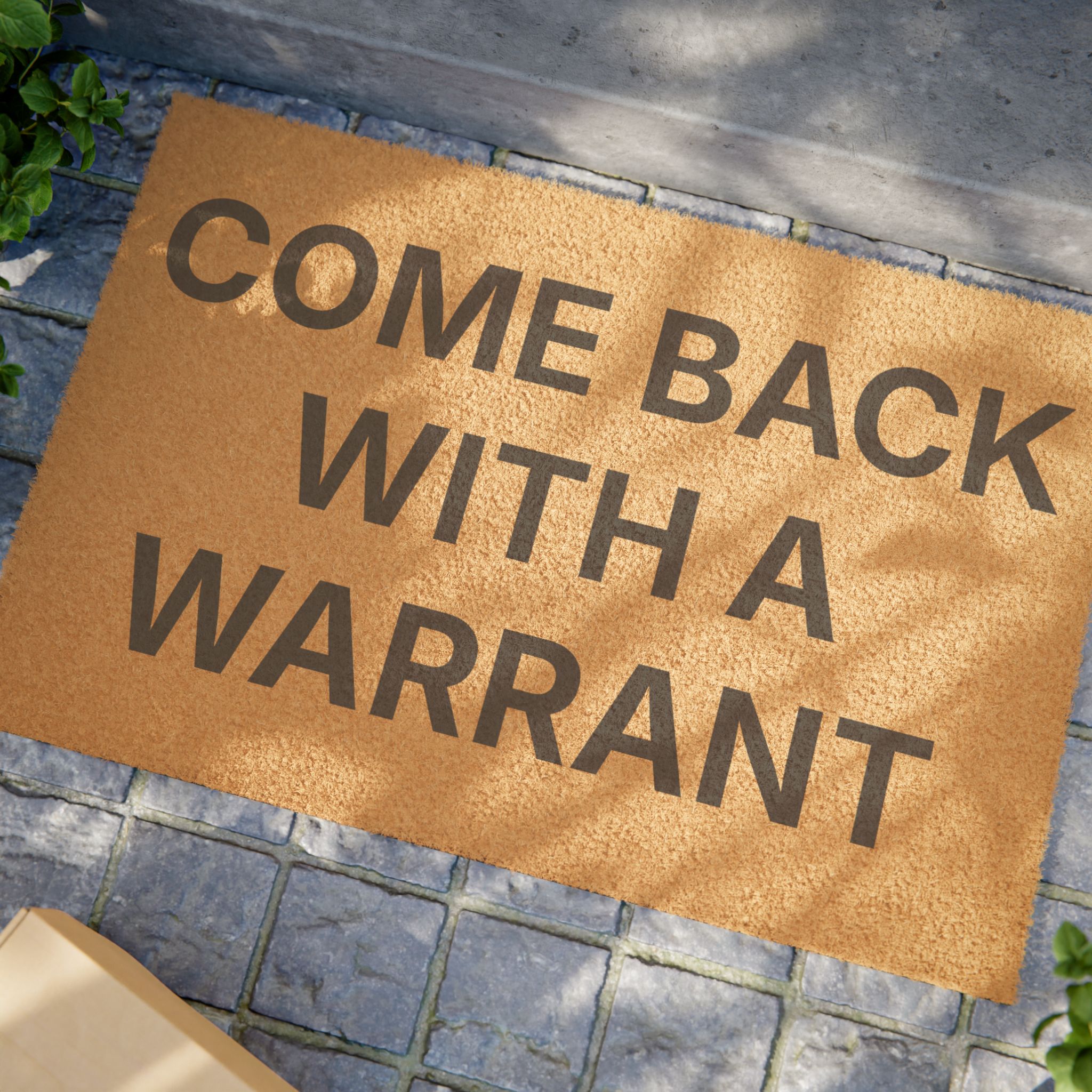A humorous doormat with the phrase ‘Come Back with a Warrant,’ perfect for those looking to add a touch of personality to their entryway. Ideal for individuals who value both privacy and a good laugh. Relevant for home decor, housewarming gifts, and welcoming guests around holidays and special occasions.