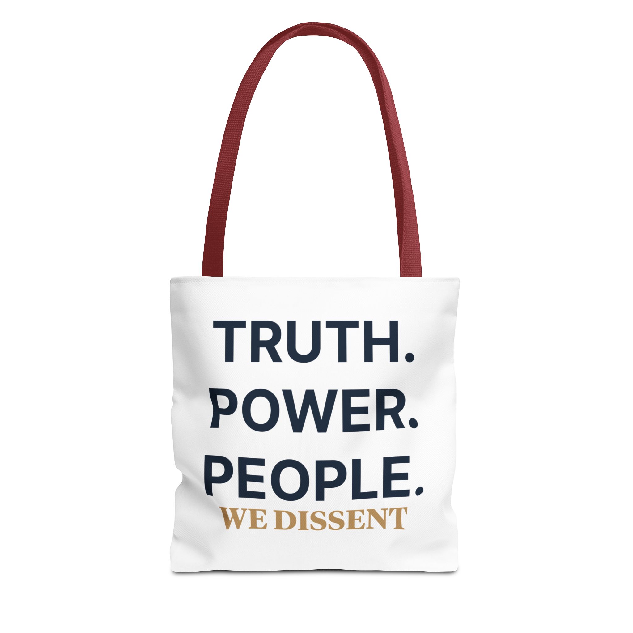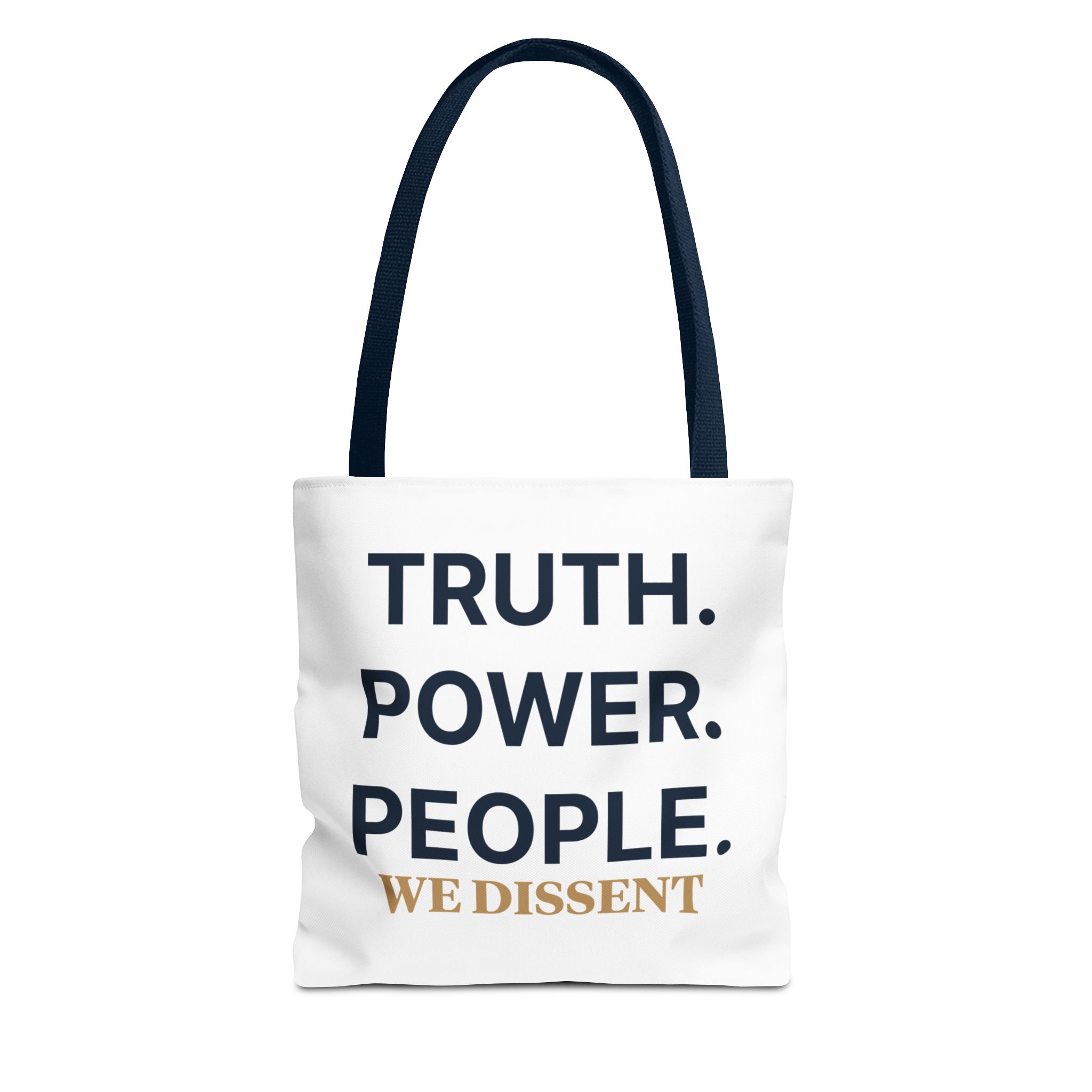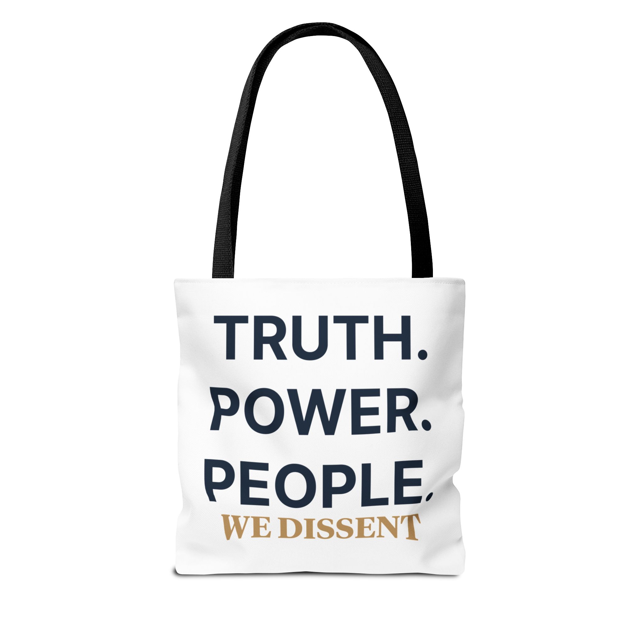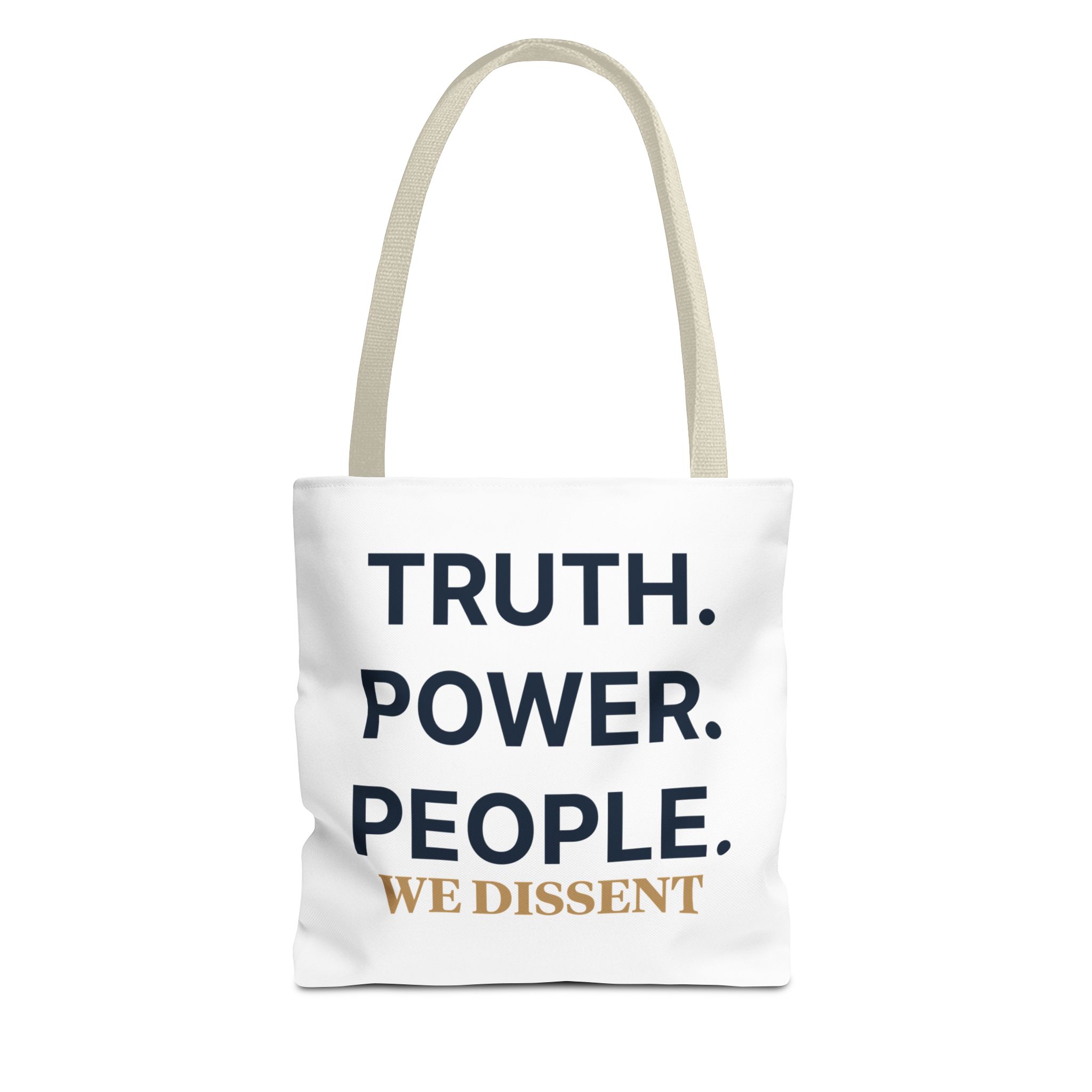 A durable tote bag featuring the words Truth Power People and We Dissent, conveying a message of populism and consent of the governed. Perfect for everyday use, this tote bag is ideal for those who value activism and civil society. Relevant for holidays, protests, political events, and everyday errands.