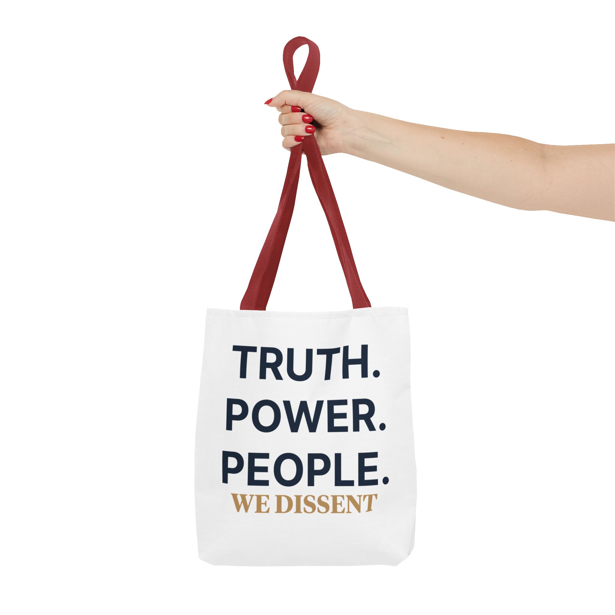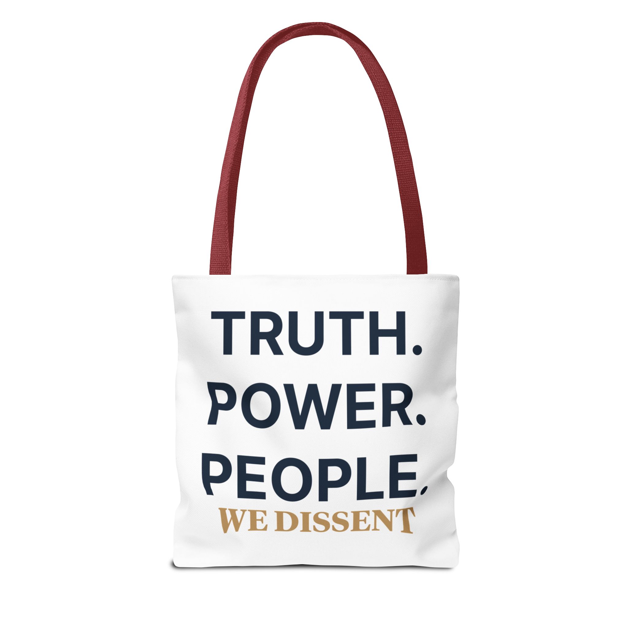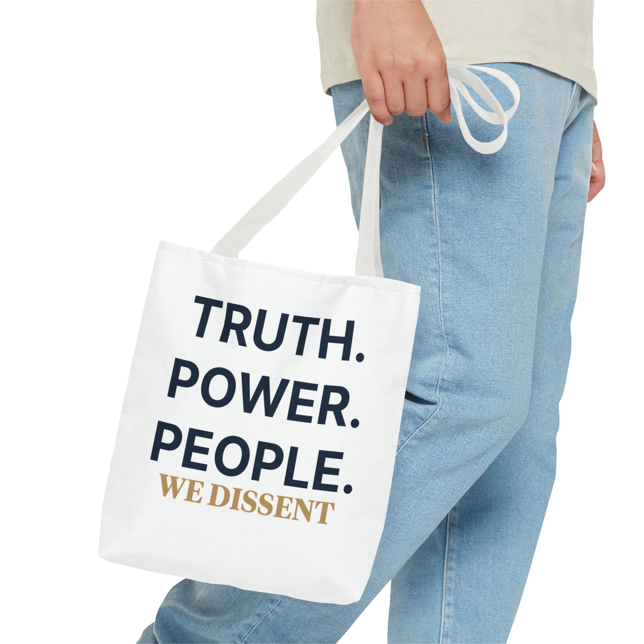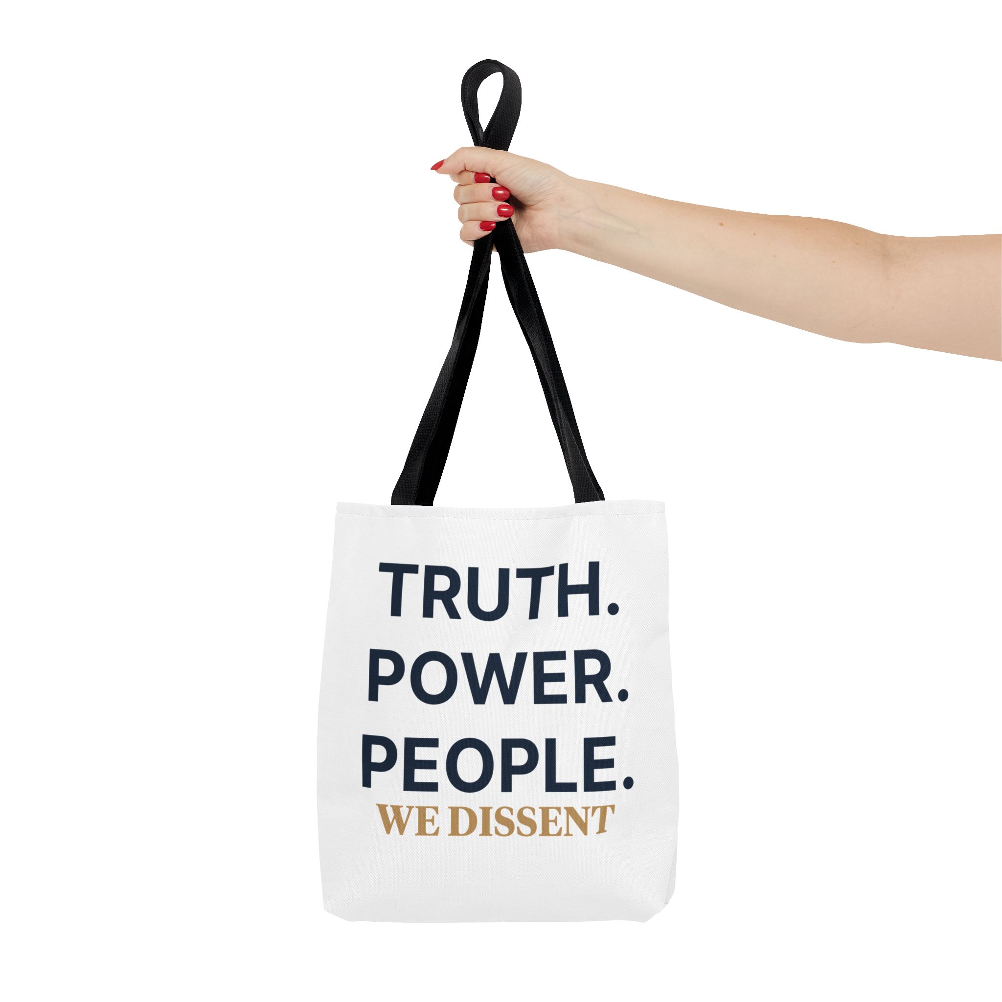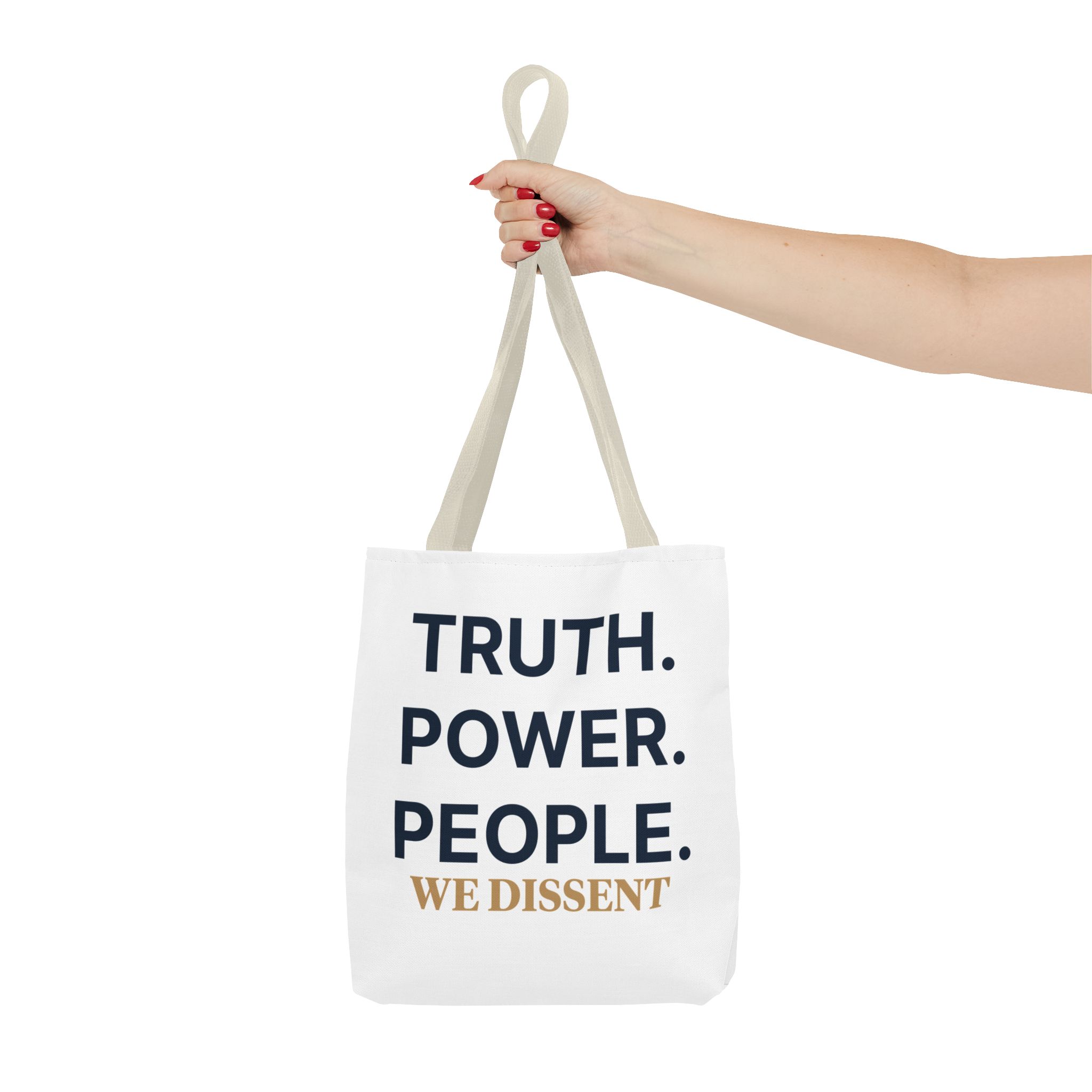 A durable tote bag featuring the words Truth Power People and We Dissent, conveying a message of populism and consent of the governed. Perfect for everyday use, this tote bag is ideal for those who value activism and civil society. Relevant for holidays, protests, political events, and everyday errands.